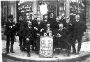 On aperçoit le fanion, les armoiries de cette confrérie devant et derrière et les 3 dés sur la table 2 fois 5 et une fois trois, symbole de la société d'adresse et de tempérance.